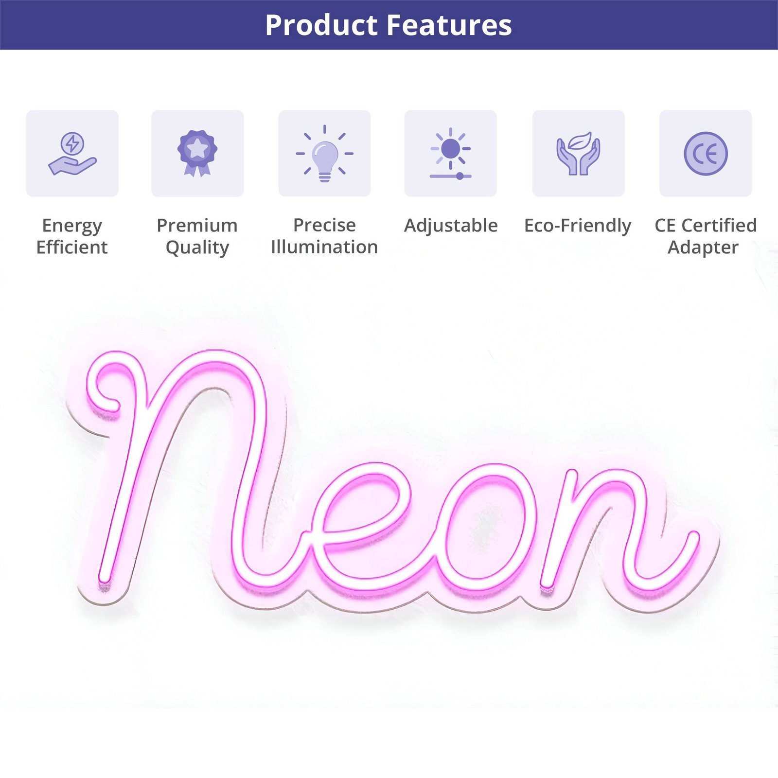 Durable Construction: Made with Neon Flex and a 0.2″ acrylic backboard for strength and modern designAdjustable Brightness: Includes a remote and dimmer to let you control the lighting intensityEnergy Efficient: Engineered for low energy consumption, perfect for indoor and outdoor settingsMultiple Size Options: Available in various dimensions to fit seamlessly into your spaceCustom Backboards: Choose from rectangle, cut-to-shape, or letter styles for a personalized appearanceEasy Setup: Plug-and-play design ensures fast and hassle-free installation